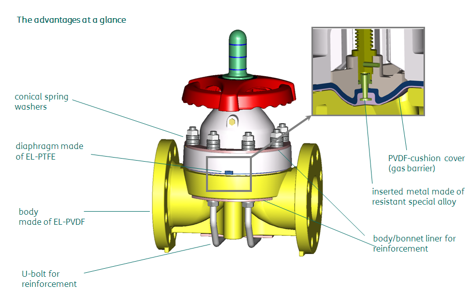 Our solution: The diaphragm valve type 14  made of  ELPVDF offering a considerably  longer service life than standard PVDF valves. A number of modifications led not only to a longer service life but also to an increased operational stability.