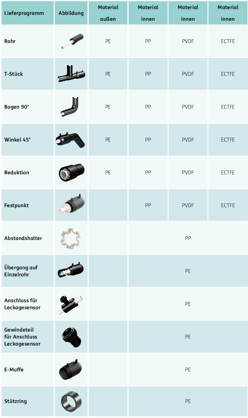 Unsere Doppelrohrsysteme ermöglichen einen überwachbaren und sicheren Medientransport in fast allen Rohrdimensionen (d 20 bis DN 3500 mm).