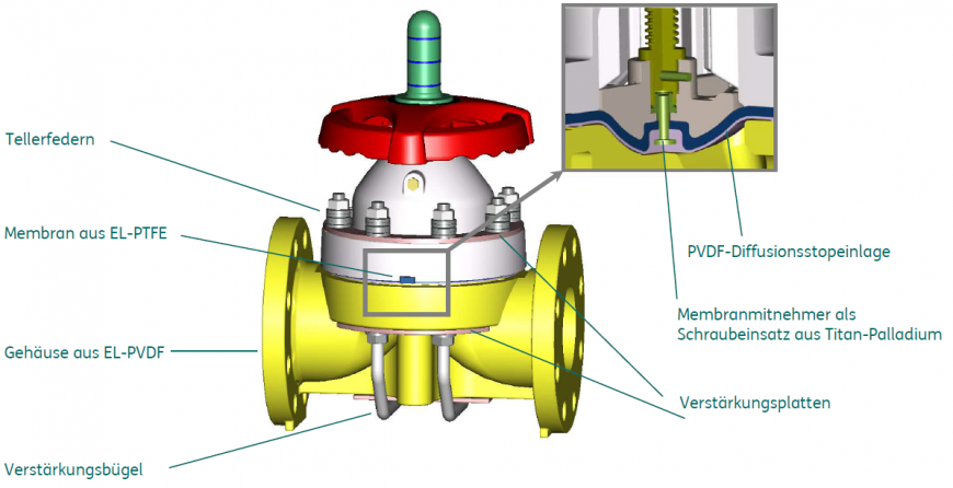 Unsere Lösung: Das ASAHI Membranventil Typ 14 aus EL-PVDF, das sich durch eine deutlich verlängerte Lebensdauer im Vergleich zu Standard-PVDF-Ventilen auszeichnet. Dieser Entwicklungserfolg wurde durch eine Reihe von Modifizierungen erreicht, die nicht nur die Lebensdauer erhöhen, sondern auch eine erhöhte Betriebssicherheit generieren.